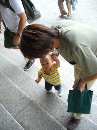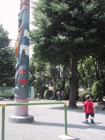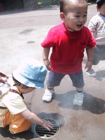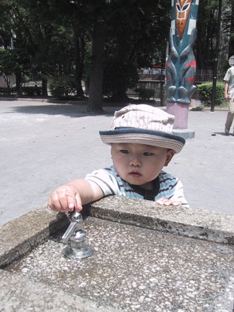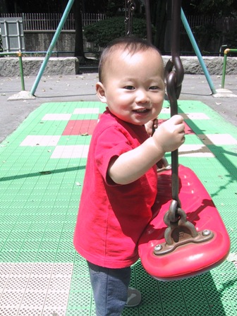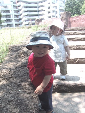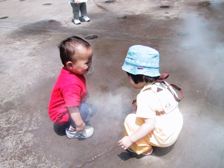 小高いところにあって、電車が見える公園。 虹くん、電車が通るたび、指をさして電車を眺めていました。 地面からミストが出てくるところがあって、 お友達と一緒に、水遊びを楽しんでいました。 ところが、帰る途中、虹くんにかぶせていた帽子を落としてしまったみたい・・・。 夕方、通った所を戻りながら歩いたけど、結局見つかりませんでした。 また買ってあげなくちゃね・・。 夕方遊びに行った公園で。 虹くん、遊んでいたら、 4、5歳くらいの双子らしき男の子がやってきました。 元気いっぱい滑り台で遊んでいるお兄ちゃんたちの様子を、 虹くんは嬉しそうに見てました。 しばらくしていっぱい遊んだので帰ろうと思ったんだけど、 なかなか帰ろうとしない虹くん。 ママが先にバギーを押して帰ろうとしても、ダメ・・。 そこで、近くにやってきた双子の男の子に、試しに、 「ね~おにいちゃん、虹くん連れてきて~。」 って冗談で頼んだら、何も言わず二人で走って、虹くんのもとに。 虹くんを両側から抱えて、ママのところまで連れてきてくれたのです。 双子の男の子の行動がとてもかわいくて、ほほえましい出来事でした。 双子もいいな~。 |