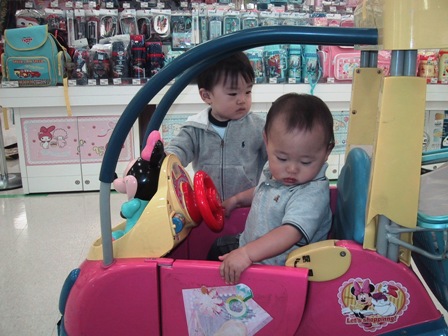 一組、一組、歯の磨き方を実践で教えてもらったよ。 虹くん、普段は嫌がるのに、教室でみんなの歯磨きの様子を見て影響されたのか、 夜は、自分からママのひざに寝転がって歯磨きをしてもらおうとしてました。 そのあとヨーカドーにて。 お友達と、カートの取り合いっこ。 ちなみに、このカートは別の親子が使ってるものなんだけど・・・。 トイレトレーニングの手始め?に、 お風呂前にいつも子供用の便座に座らせているんだけど、 これまた、だんだん座ることを覚えたようで、 トイレで便座を見つけると、自分から座りたがるようになりました。 今日は一度座らせたら、なかなか降りようとしなくて大変。。 便座から降ろそうとすると、嫌がるし、 ドアまで閉める始末・・・。 「じゃあ、ずっと座ってなさい!!」と、虹くんをずっと便座に座らせておきました。 まだ用を足したことはないんだけど、 ちゃんと何をするところか分かってるのかな・・・? とにかく、便座好きになった虹くんでした。 |